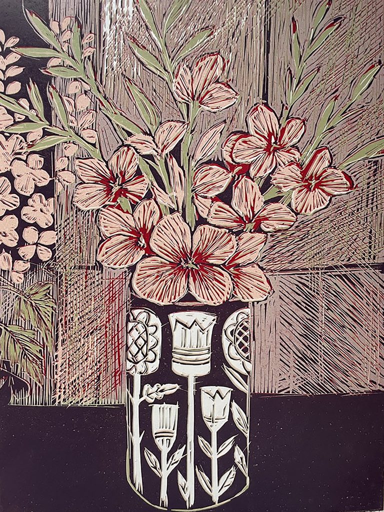 Leaf Vase with Flowers. Lino Print 30x40cm